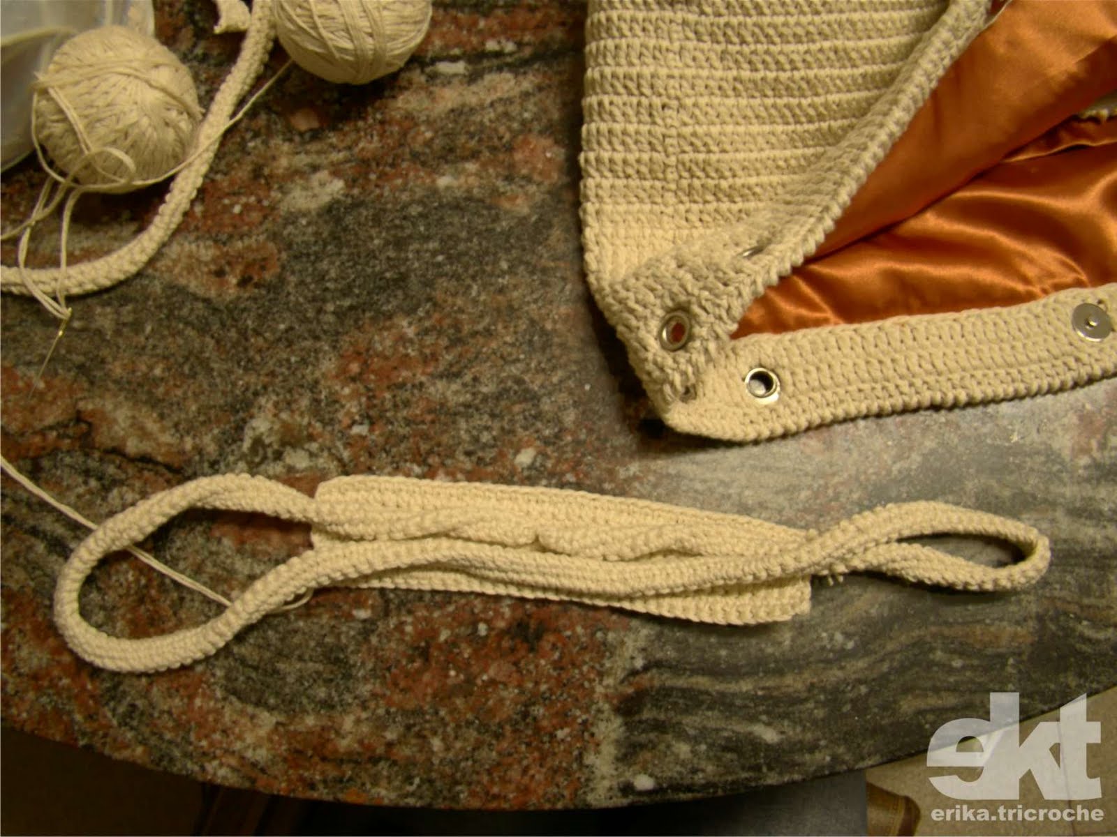 ![]() Для того, чтобы ремень составит 2 равна: Начните с 74 см корр, снова 4 Карр, вперед и назад, начала до конца и зашить шов руки. Возьмите зажим ручки, равный 2: С 38 ч, подкожно в течение 8 Карр сделать и закончить. Добавить ручка начала до конца и и сложите пополам, как показано на фото выше, помещая зажим обрабатывает в два раза. И сшить края с ручной строчкой. Сделайте то же самое с другой ручкой.